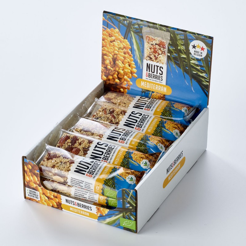 Ingrediente: alune de padure *18 %, sirop de agave*, migdale* 13%, curmale*, seminte susan*11%, stafide* 10%, fulgi de ovaz* 4%, sirop de orez*. *din agricultura ecologica. Valori nutritionale/40 g: energie 146 kcal, grasimi 8 g, din care grasimi saturate 0.7 g, proteine 3.38 g, carbohidrati 13.24 g, fibre 2.3 g, zaharuri 8.6 g, sare 14.65 mg. Contine gluten, nuci cu coaja lemnoasa, si seminte de susan. A se pastra la loc uscat si racoros. Valabilitate: vezi data inscrisa pe ambalaj. Producator: NUTSANDBERRIES BE, Belgia, BE-BIO-02, Agricultura EU/non-EU. Distribuitor: SC MANAGIS SERV SRL Cluj-Napoca, Carpati, nr.20, Certificat de RO-ECO-008 www.managisbio.ro ,Tel : 0724 350 013