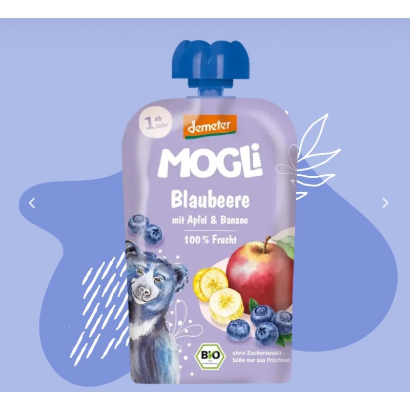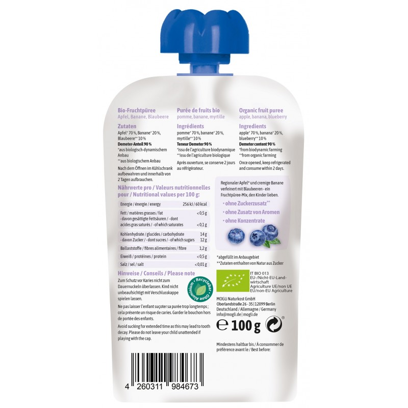 Ingrediente: mere*(70%), banane*(20%), afine**(10%). Cota Demeter 90%.*agricultura biodinamica,** agricultura ecolo- gica. Dupa deschidere se pastreaza la frigider, se consuma in decurs de 2 zile. Contine zaharuri prezente in mod natural. Fara arome adaugate,fara zahar adaugat, fara concentrate. Consumul in exces poate favoriza aparitia cariilor dentare. Nu lasati copilul nesupravegheat daca se joaca cu capacul! Recomandat peste varsta de 1 an! Val. energ. /100g: 256KJ / 60Kcal, grasimi 0,5g din care <0,1g saturate, glucide 14 g din care 12g zaharuri, fibre 1,2 g, proteine <0,5 g, sare< 0,01. Certificat: IT-BIO-013. Agricultura UE/ non UE. A se consuma: vezi ambalaj. Produs MOGLI Naturkost, Germania. Distribuitor: MANAGIS SERV, Cluj, str. Carpati, nr.20, Certificat RO-ECO-008; 0721 307 983