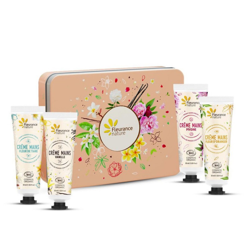 set cadou cu numai putin de 4 creme bio intr-o cutie metalica eleganta ce preia designul inflorit si colorat al fiecareia dintre cele 4 creme parfumate pentru maini pe care le contine: